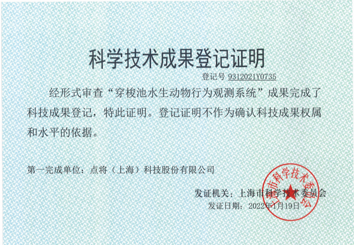 科技成果證書登記——穿梭池水生動物行為觀測系統